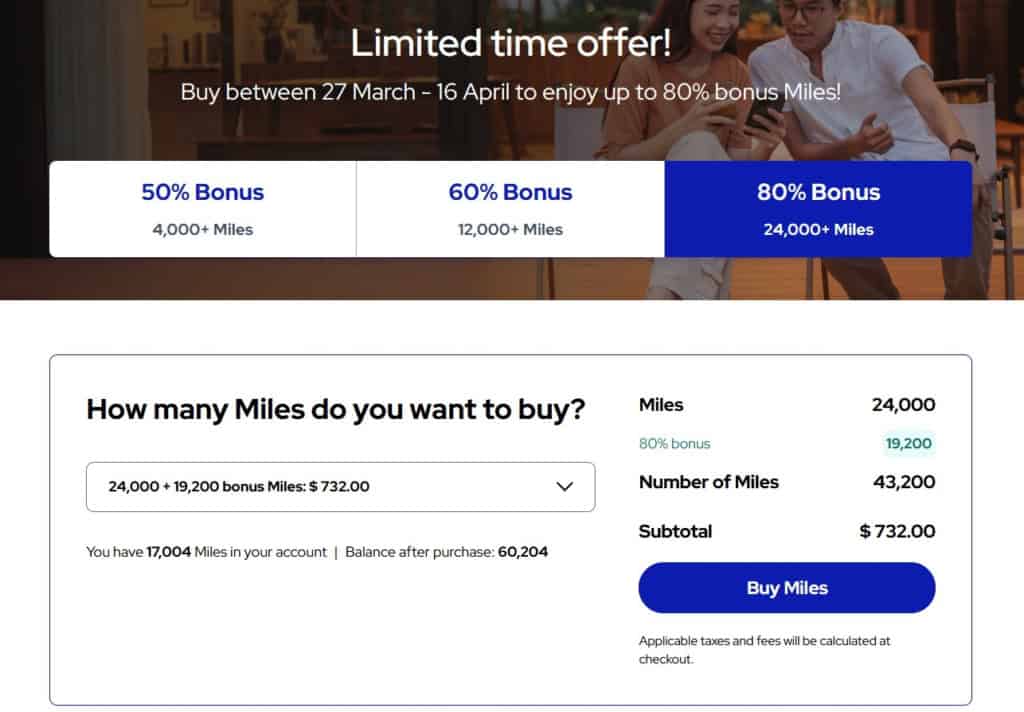 - the maximum bonus of 80% is granted from 24,000 miles purchased (price per mile EUR 0.0139 / USD 0.0169 / GBP 0.0124).