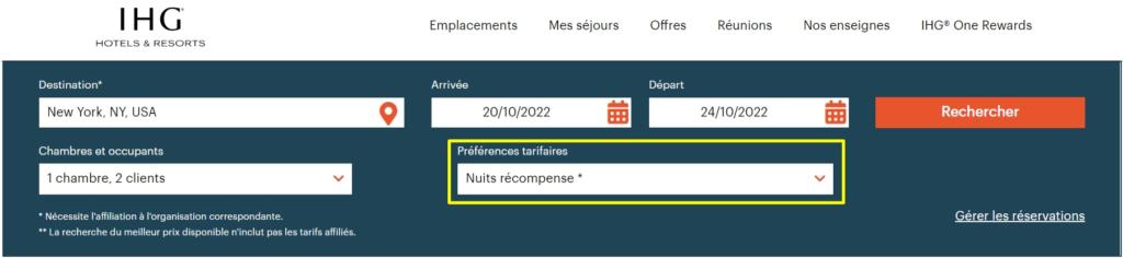 Dans le formulaire de recherche, choisir « Nuits récompense » comme préférence tarifaire.