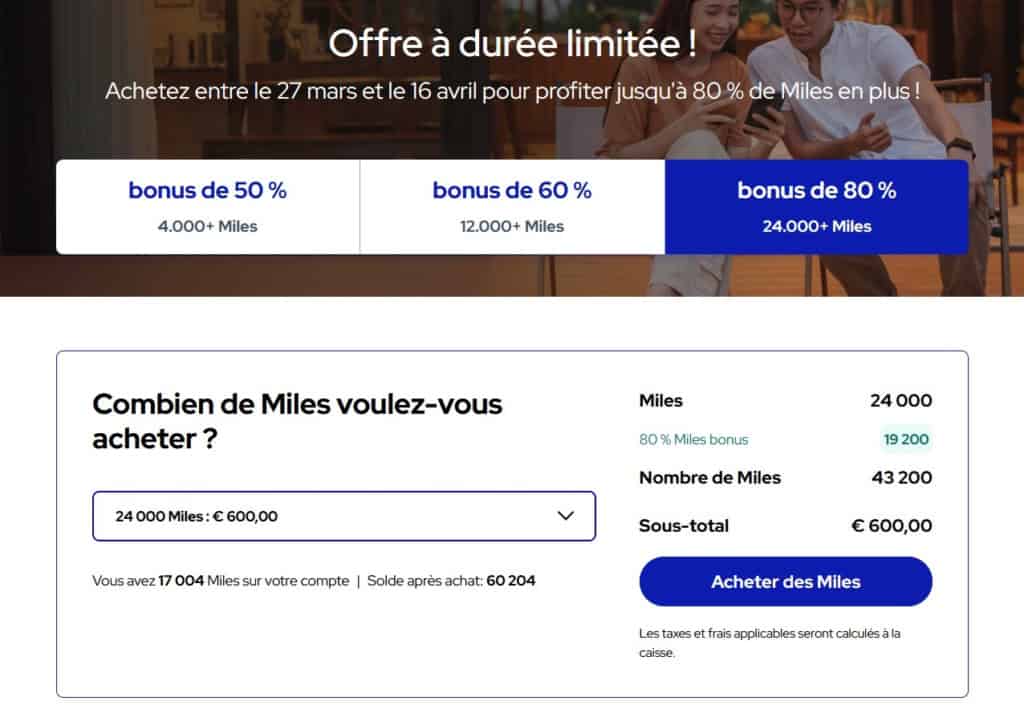 - le bonus maximal de 80% est accordé à partir de 24 000 miles achetés (prix du mile 0,0139€).